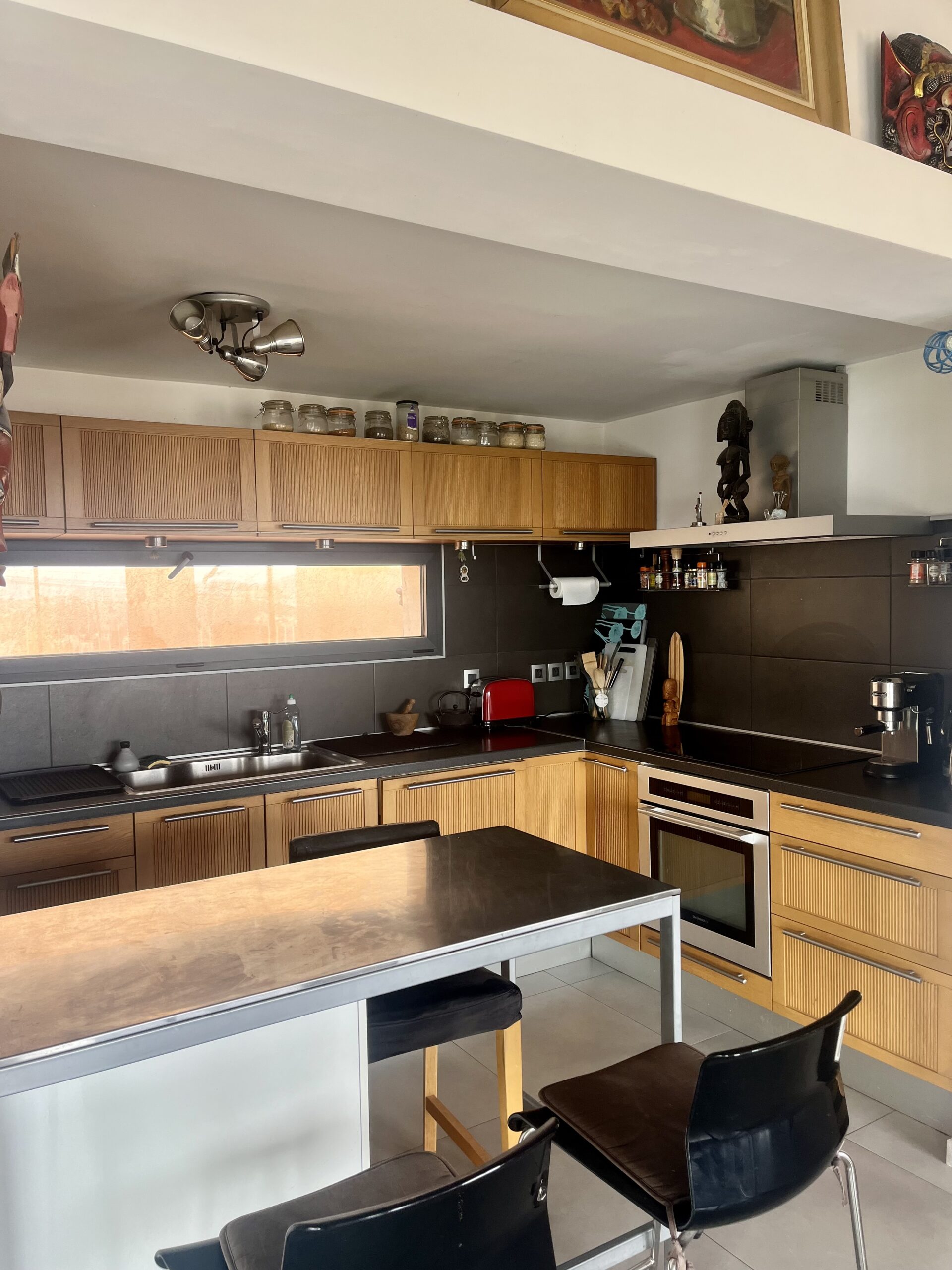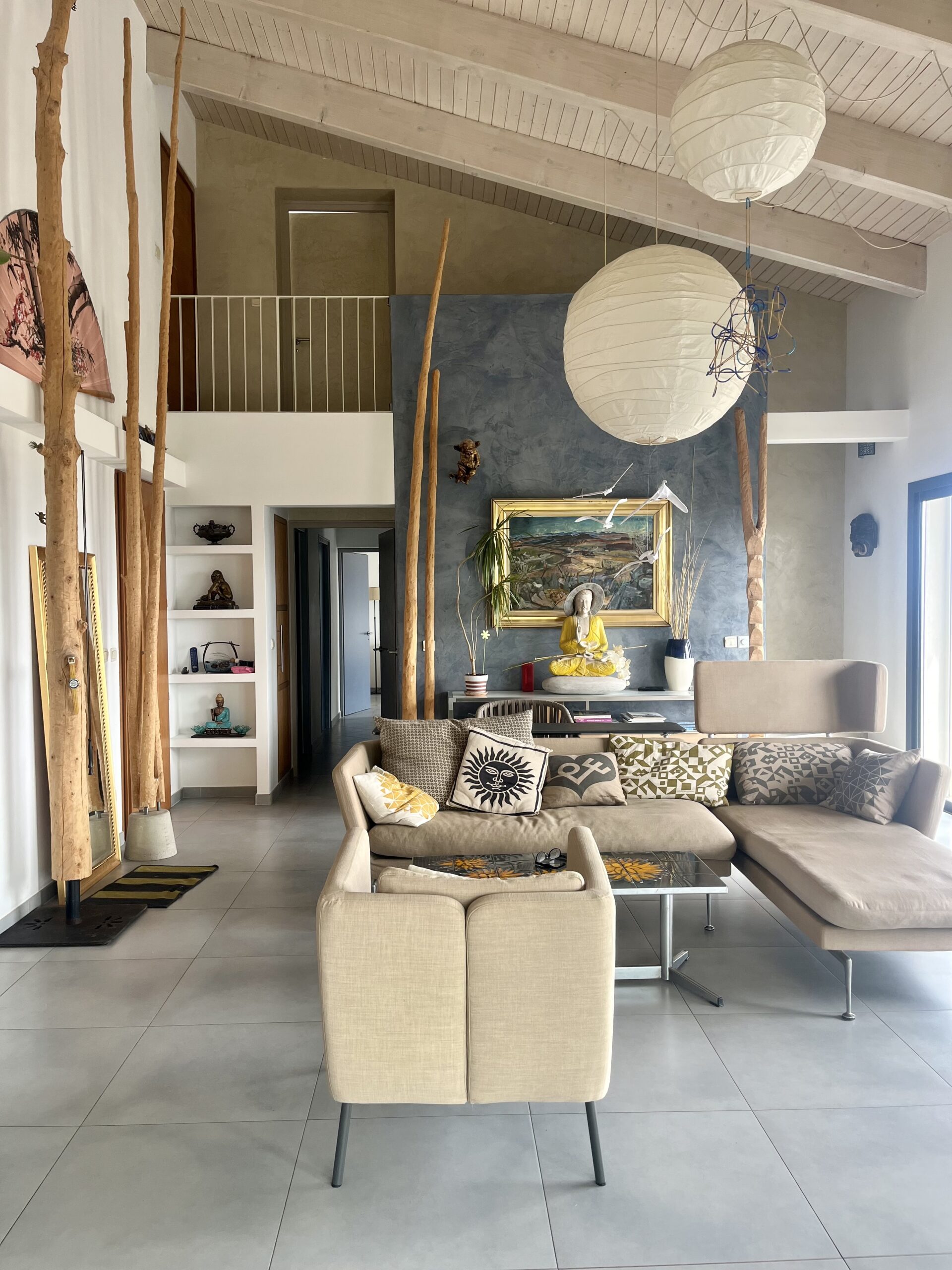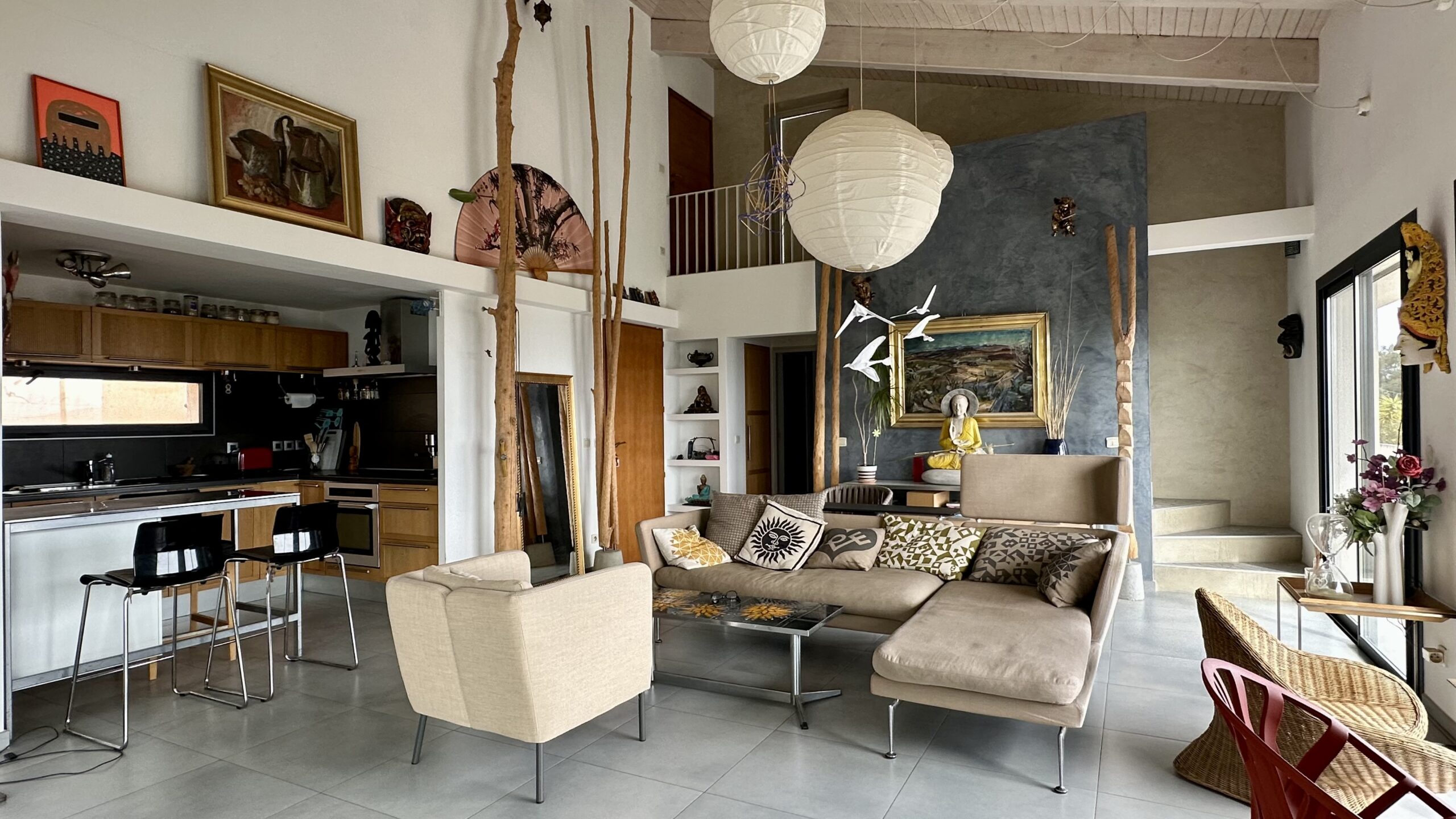 Vaste salon avec cuisine ouverte et hauteur cathédrale
